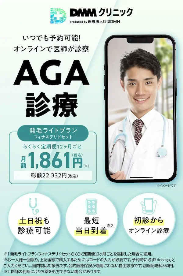 DMMオンラインクリニックは、2022年〜2025年の間に150万件以上の診療実績(全診療科目)を持つ、日本最大規模のオンライン診療プラットフォームの一つです。AGA治療においては、診察料0円・らくらく定期便で月2,097円〜という業界最安水準の価格と、スマホで完結する利便性が支持を集めています。